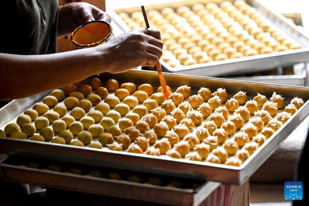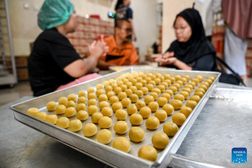 Staff members make traditional cookies ordered by costumers for Eid al-Fitr at Kampung Nastar in Tangerang, Banten Province, Indonesia, March 16, 2025. (Xinhua/Agung Kuncahya B.)