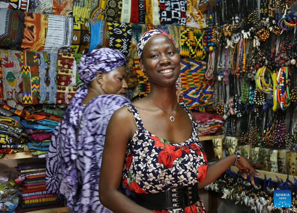 A shopkeeper introduces handicrafts to tourists at a market in Banjul, capital of The Gambia, on March 15, 2025.