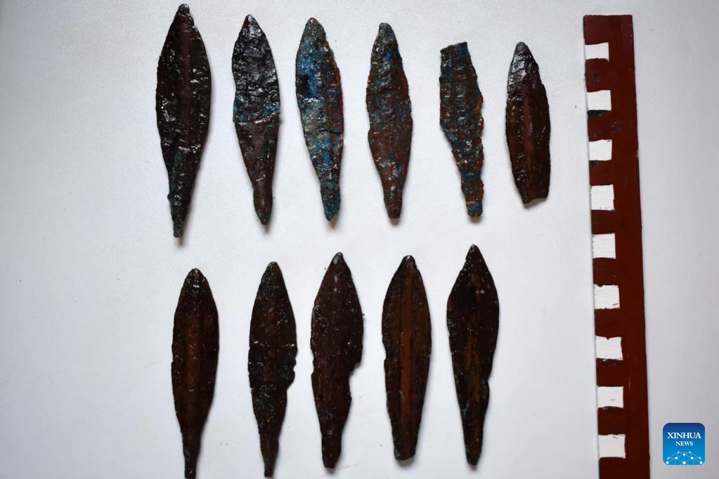 This undated photo shows artifacts from ancient tombs uncovered in the Maskhouta area of Ismailia Governorate, Egypt. An Egyptian archaeological mission has uncovered a tomb of a military leader from the reign of King Ramses III (around 1184 BC-1153 BC), the second king of the 20th Dynasty, the Egyptian Ministry of Tourism and Antiquities announced on Thursday.
