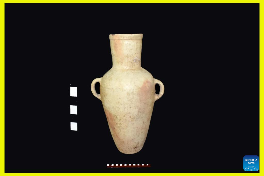 This undated photo shows a vessel from an ancient tomb uncovered in the Maskhouta area of Ismailia Governorate, Egypt. An Egyptian archaeological mission has uncovered a tomb of a military leader from the reign of King Ramses III (around 1184 BC-1153 BC), the second king of the 20th Dynasty, the Egyptian Ministry of Tourism and Antiquities announced on Thursday.