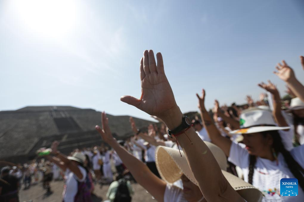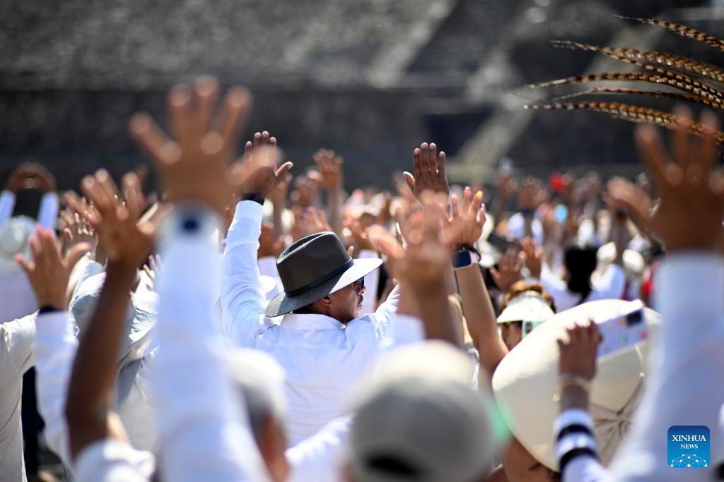 People bask in the sunshine during the Spring Equinox at the Pyramid of the Sun in the archaeological zone of Teotihuacan, Mexico, March 21, 2025. Every Spring Equinox, people gather to "gather energy" at the Pyramid of the Sun here. (Xinhua/Li Muzi)