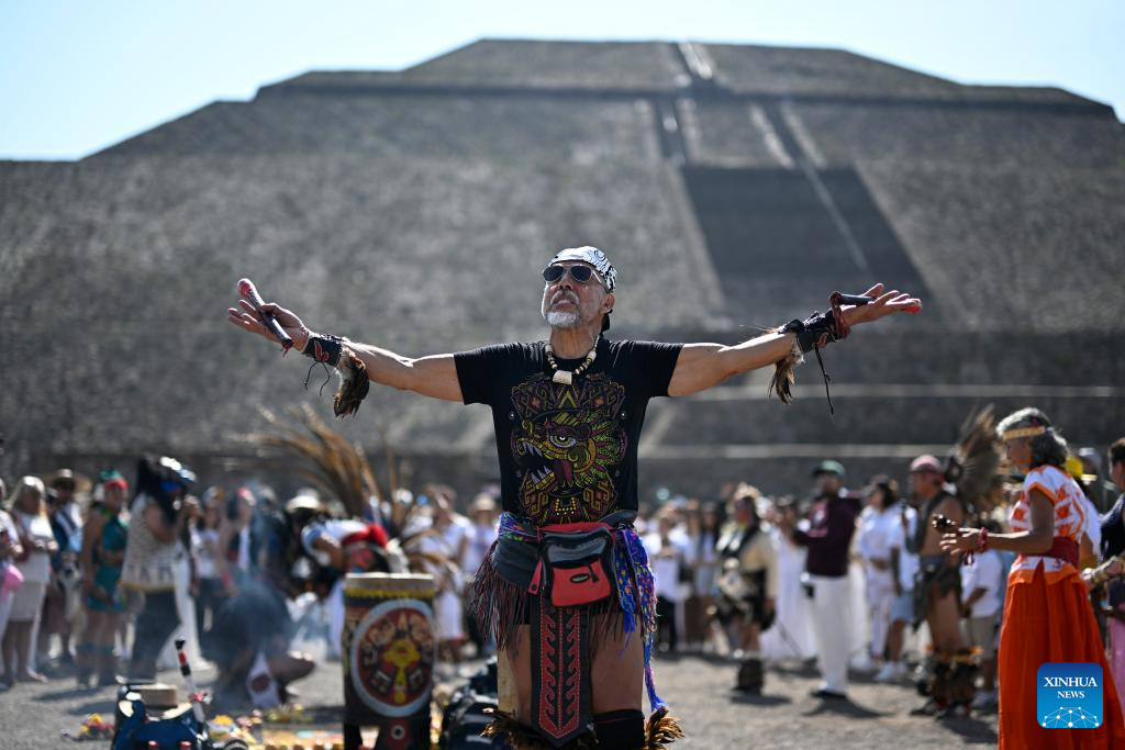 A man attends an event to welcome the Spring Equinox at the Pyramid of the Sun in the archaeological zone of Teotihuacan, Mexico, March 21, 2025. Every Spring Equinox, people gather to "gather energy" at the Pyramid of the Sun here. (Xinhua/Li Muzi)