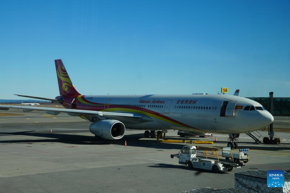 This photo taken on March 22, 2025 shows a plane of Hainan Airlines at Oslo Gardermoen International Airport in Akershus County, Norway. Chinese carrier Hainan Airlines on Saturday officially launched its direct flight route between Beijing and Oslo, further strengthening air connectivity between China and Northern Europe. (Photo by Bai Yun/Xinhua)