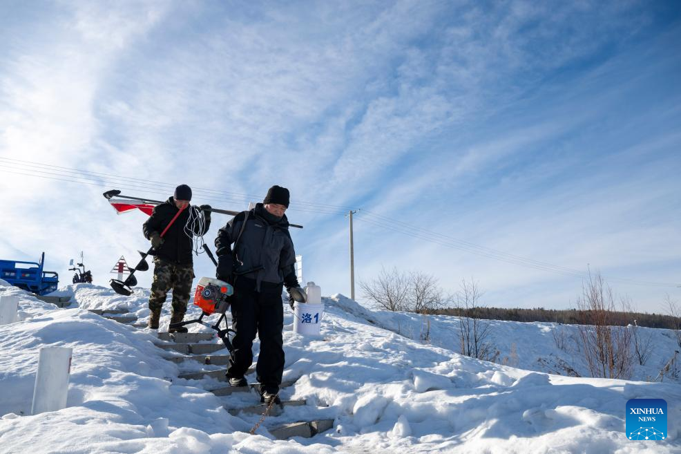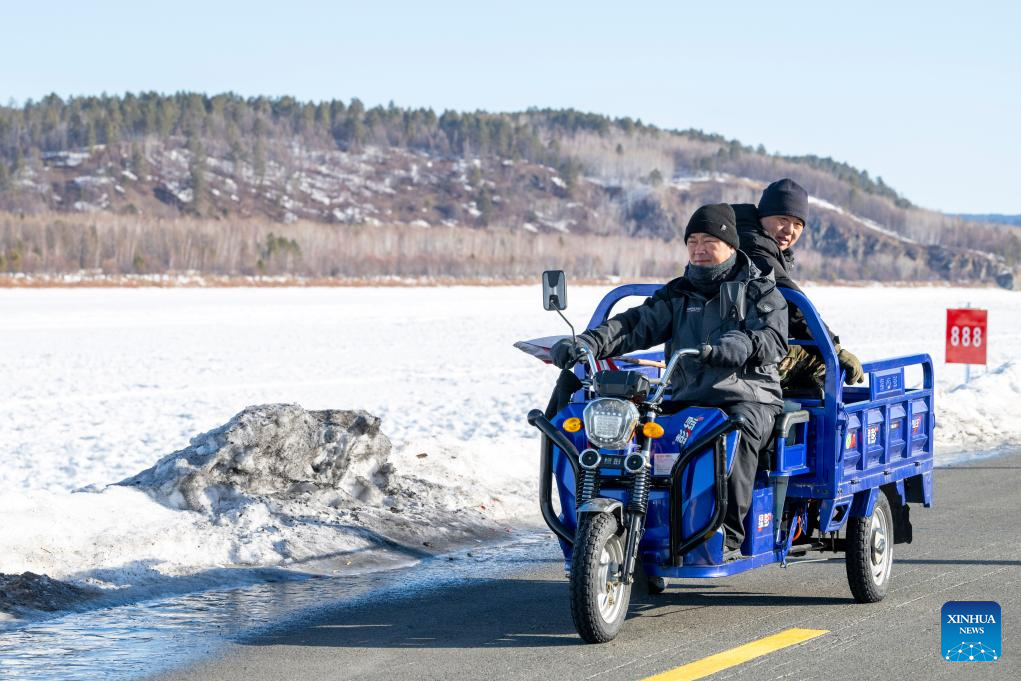 Staff members of the Luogu River hydrological station head for a monitoring operation zone in Mohe, northeast China's Heilongjiang Province, March 21, 2025. (Xinhua/Zhang Tao)