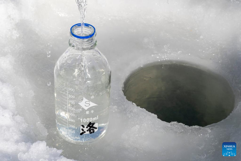 The water sample is collected at a monitoring operation zone of the Luogu River hydrological station in Mohe, northeast China's Heilongjiang Province, March 21, 2025. (Xinhua/Zhang Tao)