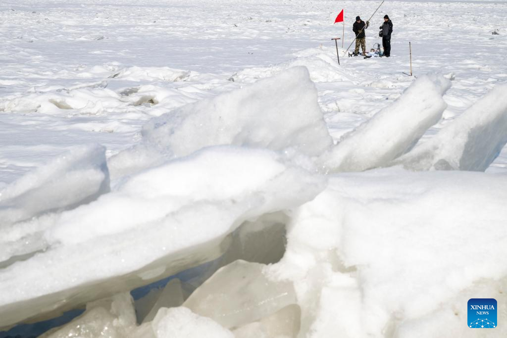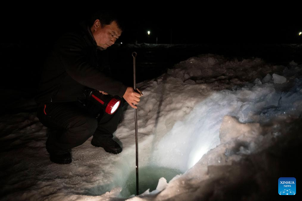 Staff members of the Luogu River hydrological station conduct a monitoring operation in Mohe, northeast China's Heilongjiang Province, March 21, 2025. (Xinhua/Zhang Tao)