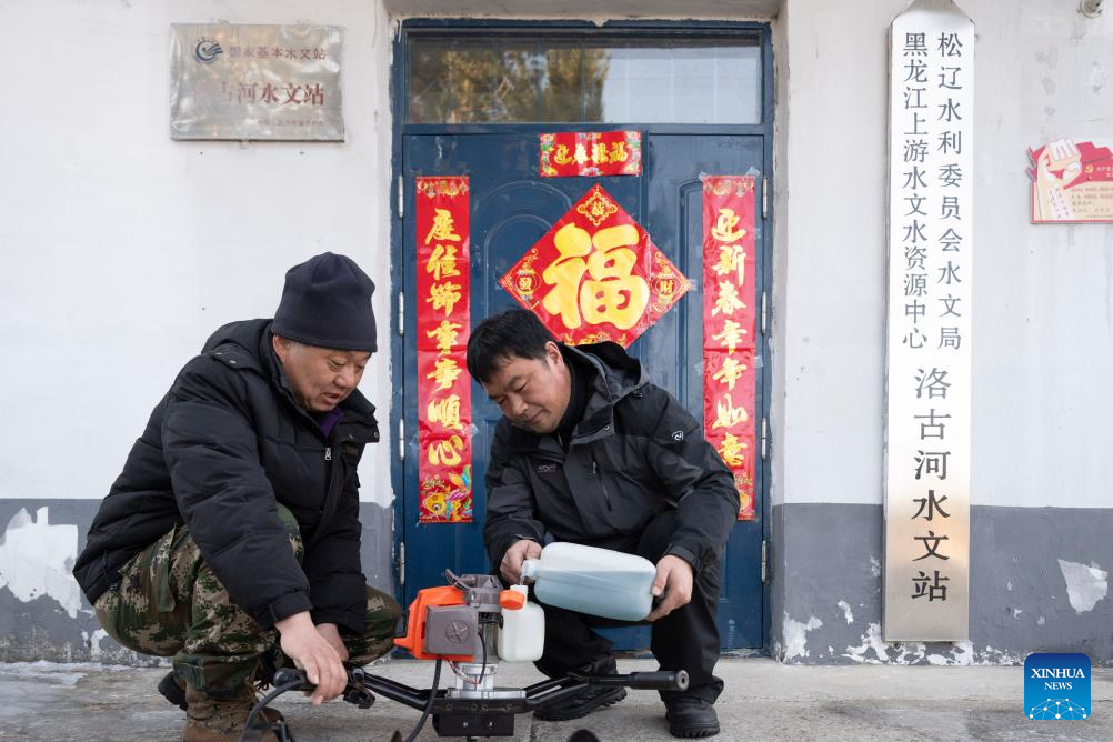 Staff members of the Luogu River hydrological station refuel the equipment in Mohe, northeast China's Heilongjiang Province, March 21, 2025. (Xinhua/Zhang Tao)