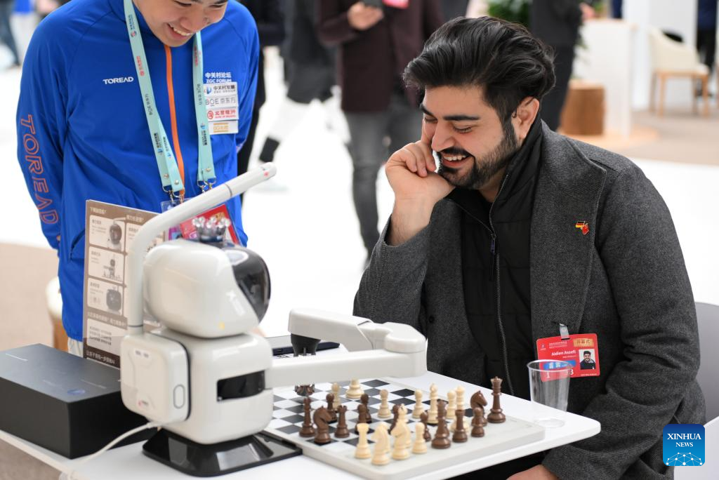 A participant plays chess with a robot during the 2025 Zhongguancun Forum Annual Conference in Beijing, capital of China, March 27, 2025.