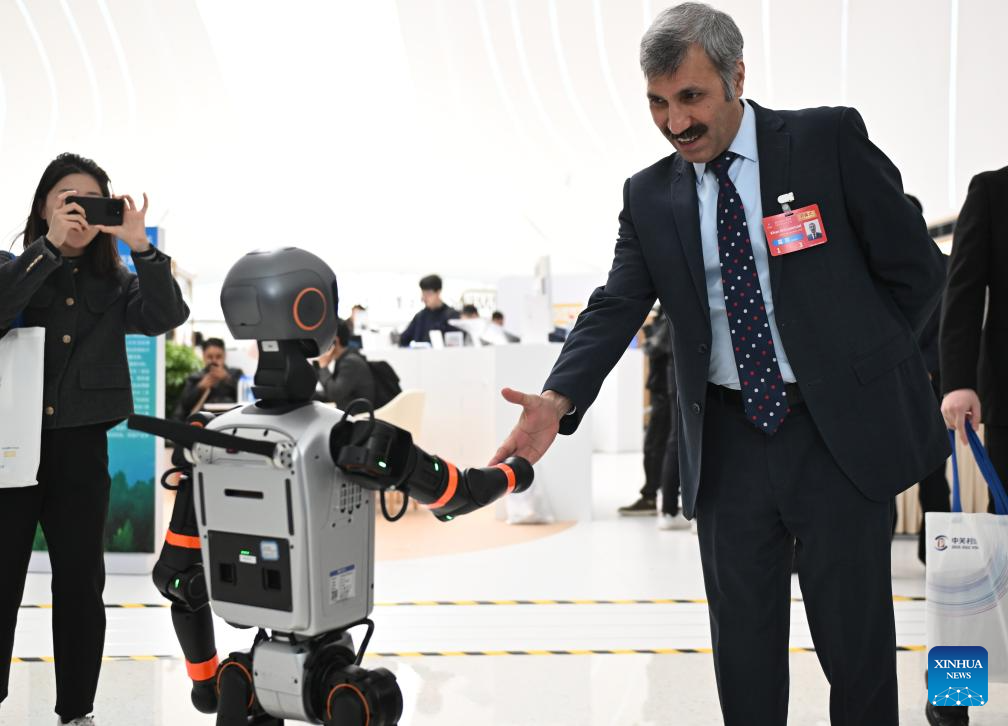 A participant shakes hands with a robot during the 2025 Zhongguancun Forum Annual Conference in Beijing, capital of China, March 27, 2025.