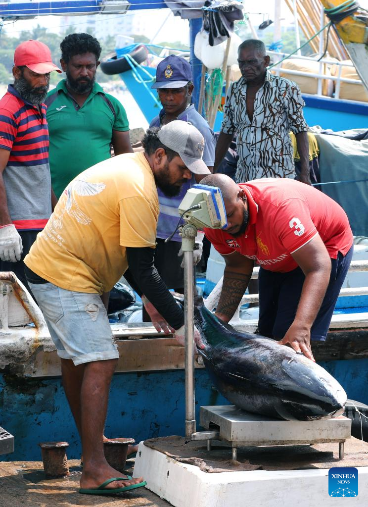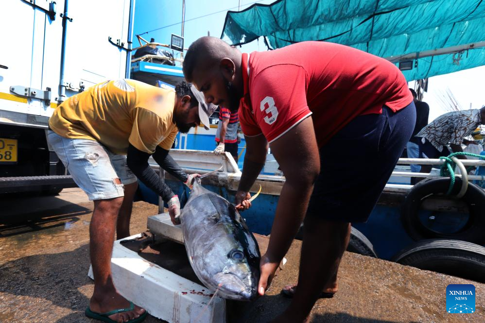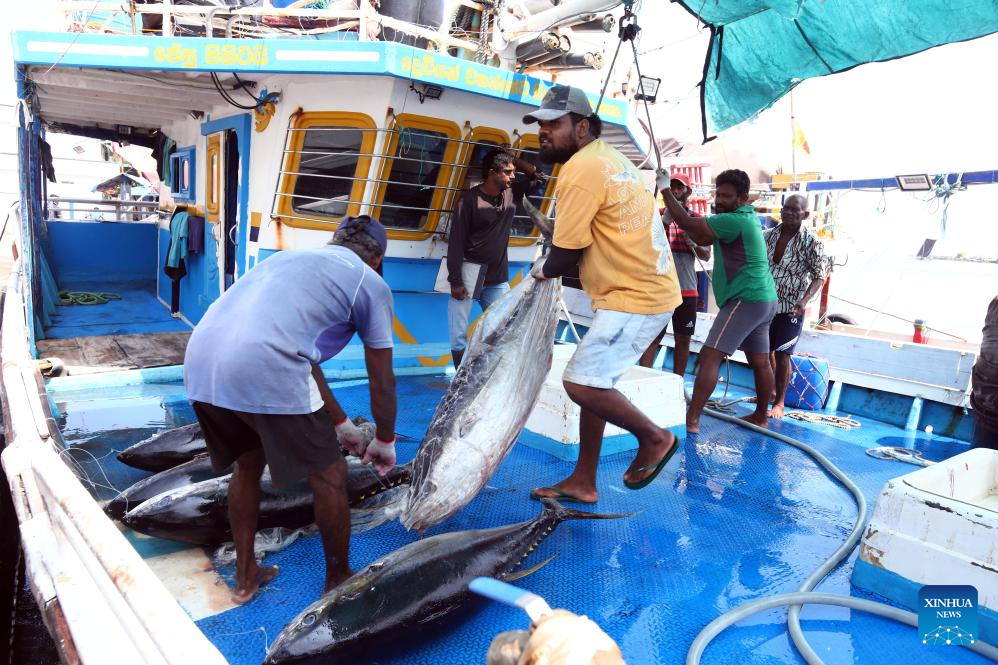 Fishermen unload tunas from a fishing trawler in Negombo, Sri Lanka, March 26, 2025.