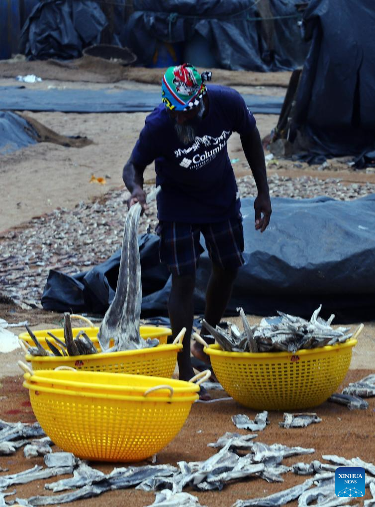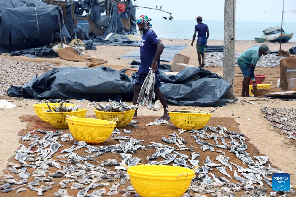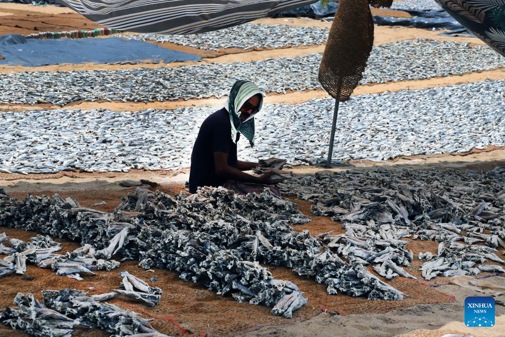 This photo taken on March 26, 2025 shows dried fishes being arranged neatly on a beach in Negombo, Sri Lanka.