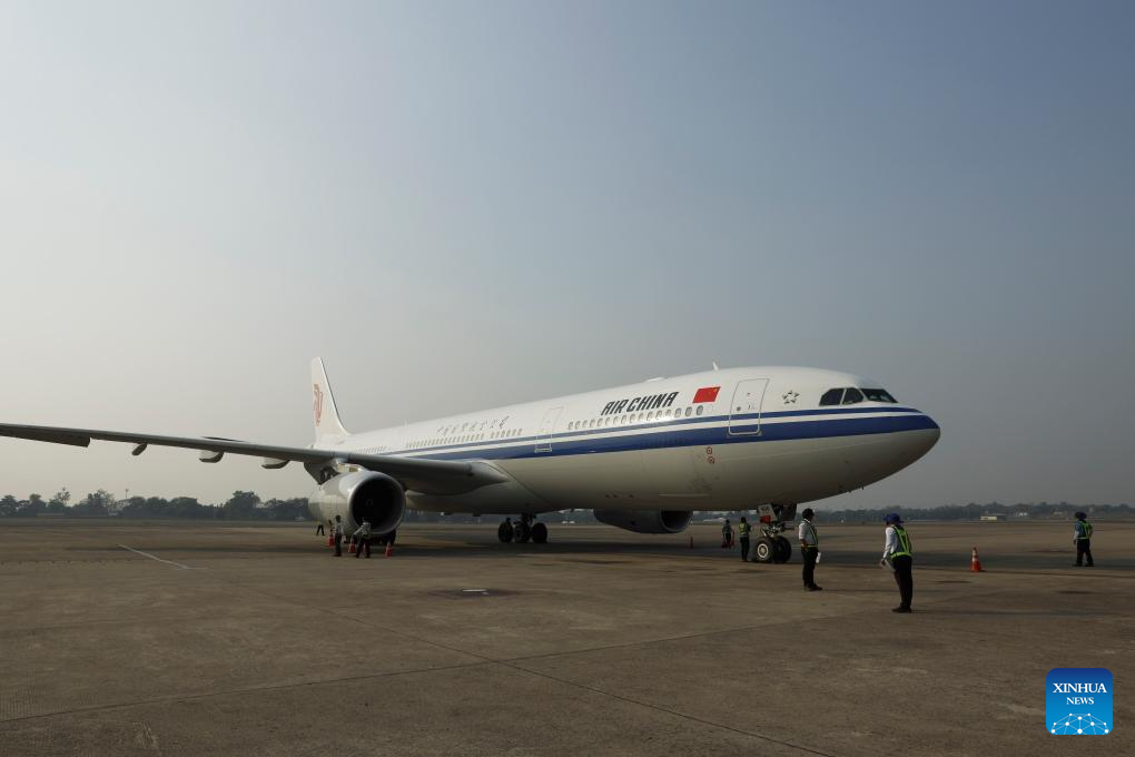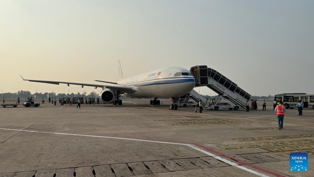 An airplane carrying a Chinese rescue team arrives at Yangon International Airport in Yangon, Myanmar, March 29, 2025. A Chinese rescue team arrived at Yangon International Airport in Myanmar on Saturday afternoon to assist in disaster relief efforts following a devastating earthquake that jolted Myanmar on Friday, claiming over 1,000 lives and injuring more than 2,300. (Xinhua/Li Guangtao)