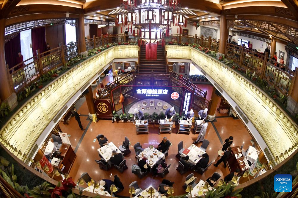 Customers have meals at the first-ever store of Quanjude on the Qianmen Street in Beijing, capital of China, March 25, 2025. (Xinhua/Li Xin)
