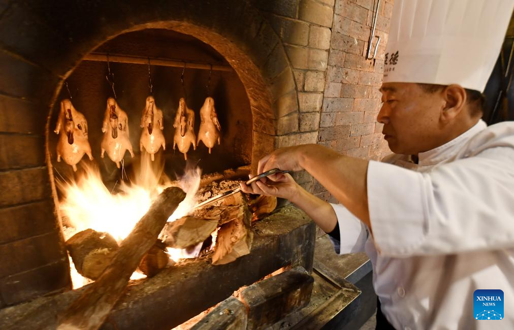 Wu Yubo takes roasted ducks out of an oven at the Hepingmen store of Quanjude in Beijing, capital of China, March 13, 2025. (Xinhua/Li Xin)
