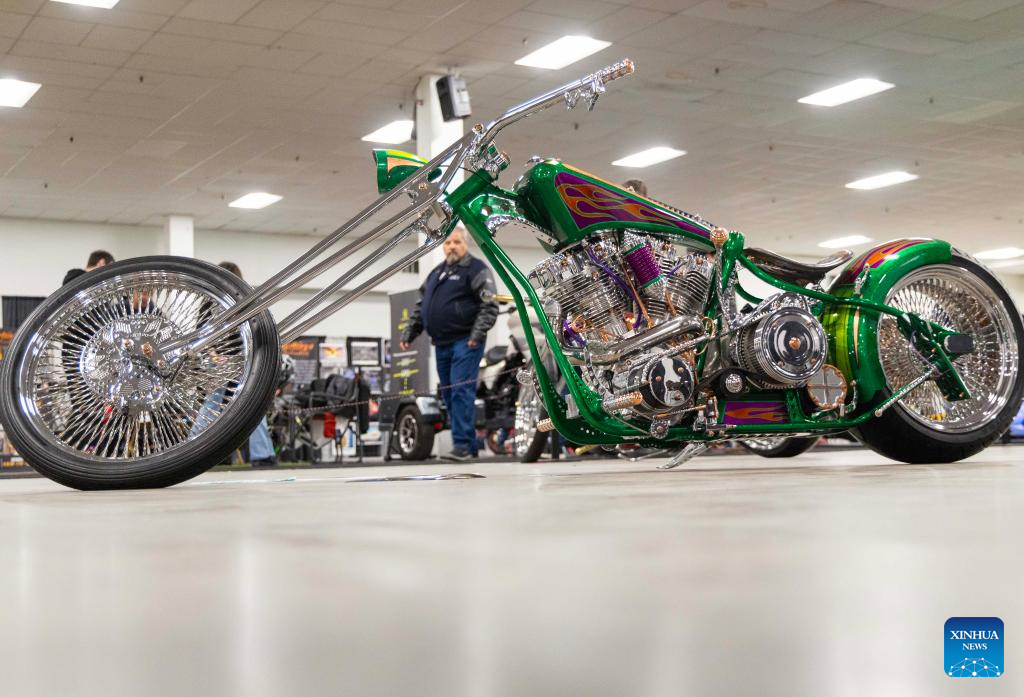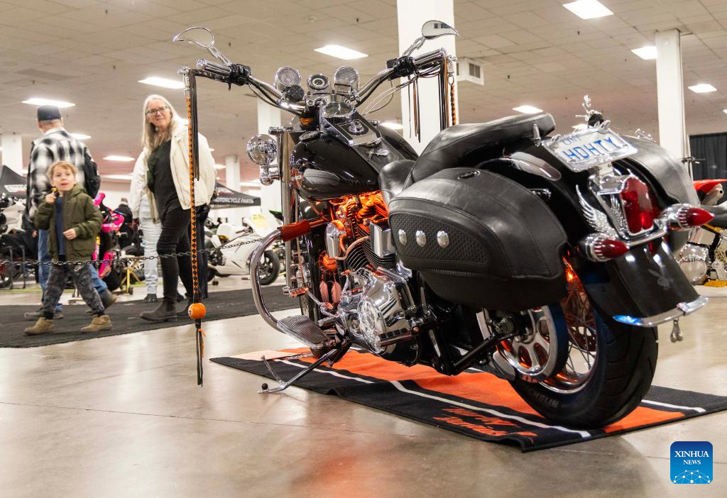 People look at a custom motorcycle during the 2025 Spring Toronto Motorcycle and Powersports Supershow in Mississauga, the Greater Toronto Area, Canada, on March 30, 2025. Featuring vintage motorcycles, custom motorcycles and more, the annual two-day show was held here from March 29 to 30. (Photo by Zou Zheng/Xinhua)