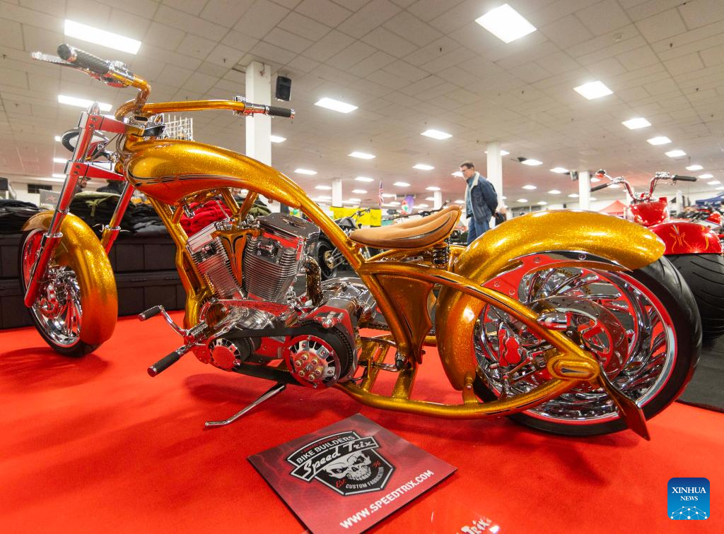 A custom motorcycle is seen during the 2025 Spring Toronto Motorcycle and Powersports Supershow in Mississauga, the Greater Toronto Area, Canada, on March 30, 2025. Featuring vintage motorcycles, custom motorcycles and more, the annual two-day show was held here from March 29 to 30. (Photo by Zou Zheng/Xinhua)