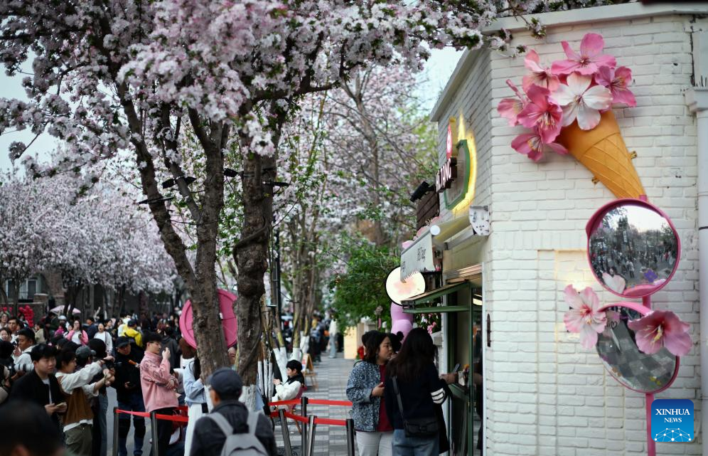 Tourists take photos of crabapple blossom-inspired ice cream at the Wudadao historical urban area in north China's Tianjin, April 4, 2025.