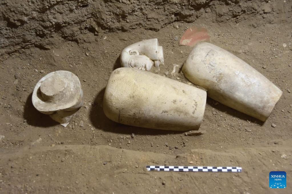 The undated photo shows artifacts uncovered from an ancient tomb in Luxor, Egypt. A joint Egyptian-French archeological mission uncovered tombs and buildings that reveal more history about the Ramesseum Temple in the southern city of Luxor, the Egyptian Ministry of Tourism and Antiquities said in a statement on Friday. (Egyptian Ministry of Tourism and Antiquities/Handout via Xinhua)