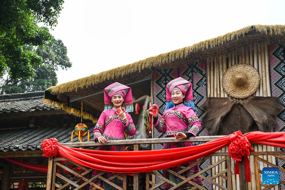 Artists performs with embroidered balls in Hechi, south China's Guangxi Zhuang Autonomous Region, Jan. 24, 2025. Guangxi Zhuang Autonomous Region is the autonomous region with the largest population of ethnic minorities in China, with multiple ethnic groups such as Zhuang, Yao, Miao, and Dong who have lived there for generations. Throwing embroidered balls is a traditional sport that Guangxi people enjoy, carrying a profound folk heritage. In Zhuang culture, embroidered ball is a symbol of love.