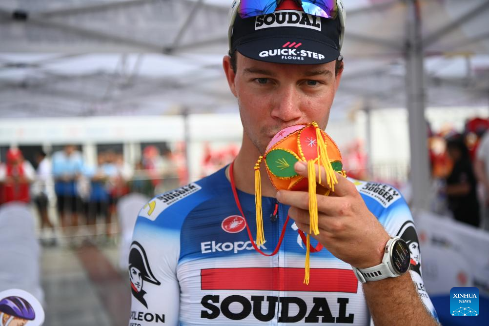 A Dutch cyclist kisses a embroidered ball after the 3rd stage of Tour of Guangxi/UCI World Tour from Jingxi to Bama, south China's Guangxi Zhuang Autonomous Region, Oct. 17, 2024. Guangxi Zhuang Autonomous Region is the autonomous region with the largest population of ethnic minorities in China, with multiple ethnic groups such as Zhuang, Yao, Miao, and Dong who have lived there for generations. Throwing embroidered balls is a traditional sport that Guangxi people enjoy, carrying a profound folk heritage. In Zhuang culture, embroidered ball is a symbol of love.
