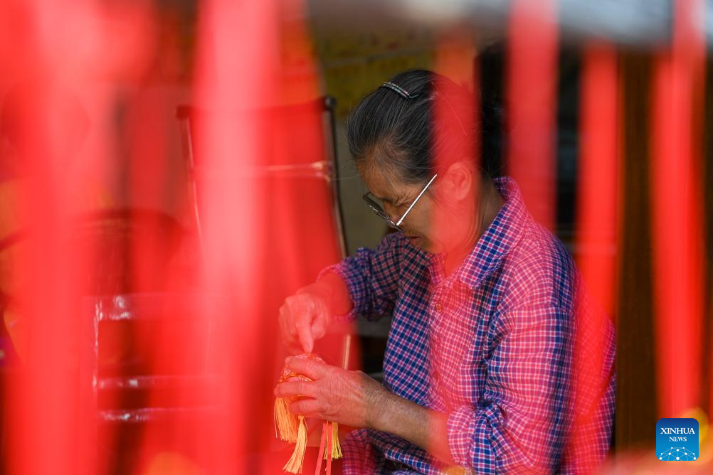 A villager makes an embroidered ball in Jiuzhou Village of Jingxi City, south China's Guangxi Zhuang Autonomous Region, April 2, 2024. Guangxi Zhuang Autonomous Region is the autonomous region with the largest population of ethnic minorities in China, with multiple ethnic groups such as Zhuang, Yao, Miao, and Dong who have lived there for generations. Throwing embroidered balls is a traditional sport that Guangxi people enjoy, carrying a profound folk heritage. In Zhuang culture, embroidered ball is a symbol of love.