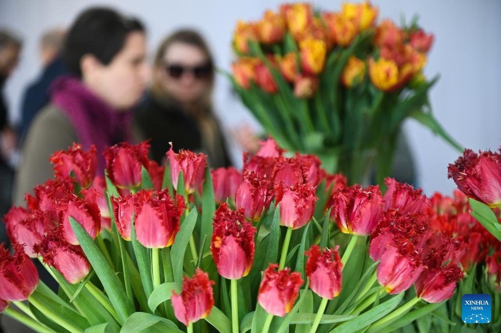 This photo taken on April 5, 2025 shows tulips on display during the 15th Tulip Exhibition at Wilanow Palace in Warsaw, Poland. The event runs through April 6. (Photo by Aleksy Witwicki/Xinhua)