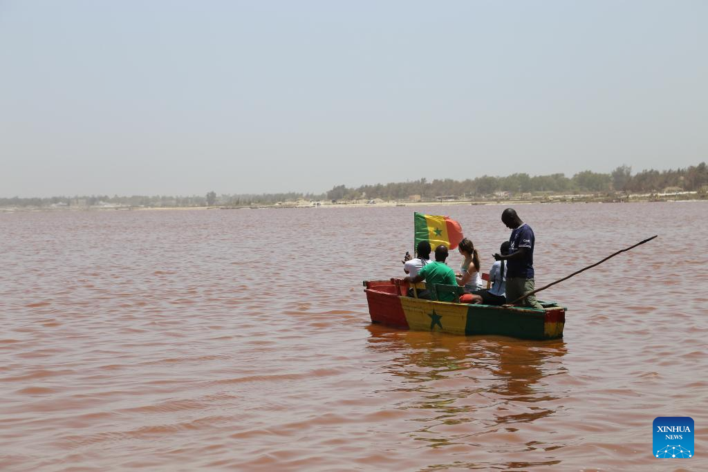 Tourists ride a sightseeing boat at the Lake Retba, also known as the Lac Rose, near Dakar, Senegal, April 6, 2025. (Xinhua/Si Yuan)