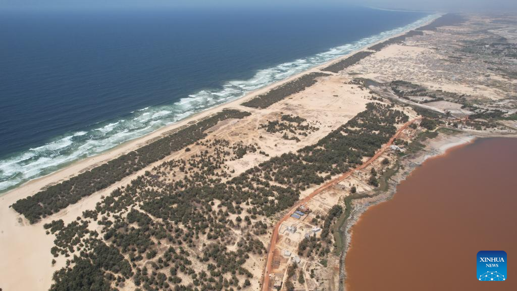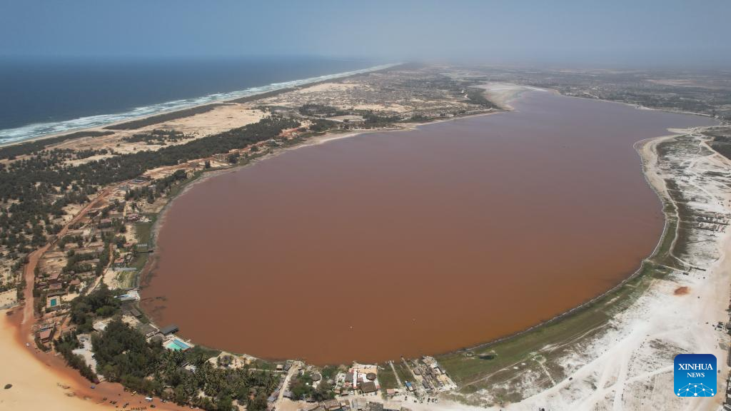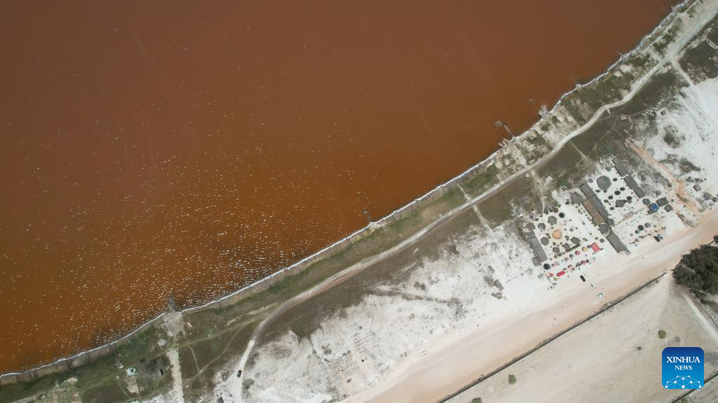 An aerial drone photo taken on April 6, 2025 shows a view of the Lake Retba, also known as the Lac Rose, near Dakar, Senegal. (Xinhua/Si Yuan)