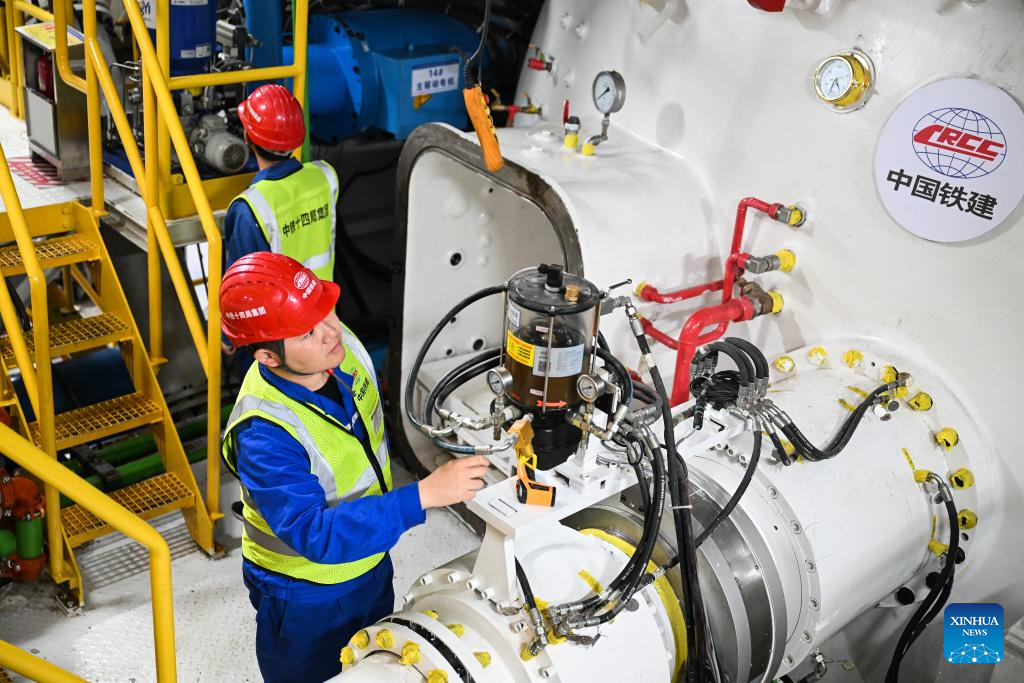 Technical staff conduct inspection inside "Jianghai," a giant self-developed tunnel boring machine deployed for the construction of the Haitai Yangtze River Tunnel, in Haimen, east China's Jiangsu Province on April 9, 2025. China on Wednesday deployed a giant self-developed tunnel boring machine (TBM) for the construction of the world's longest underwater highway TBM tunnel.