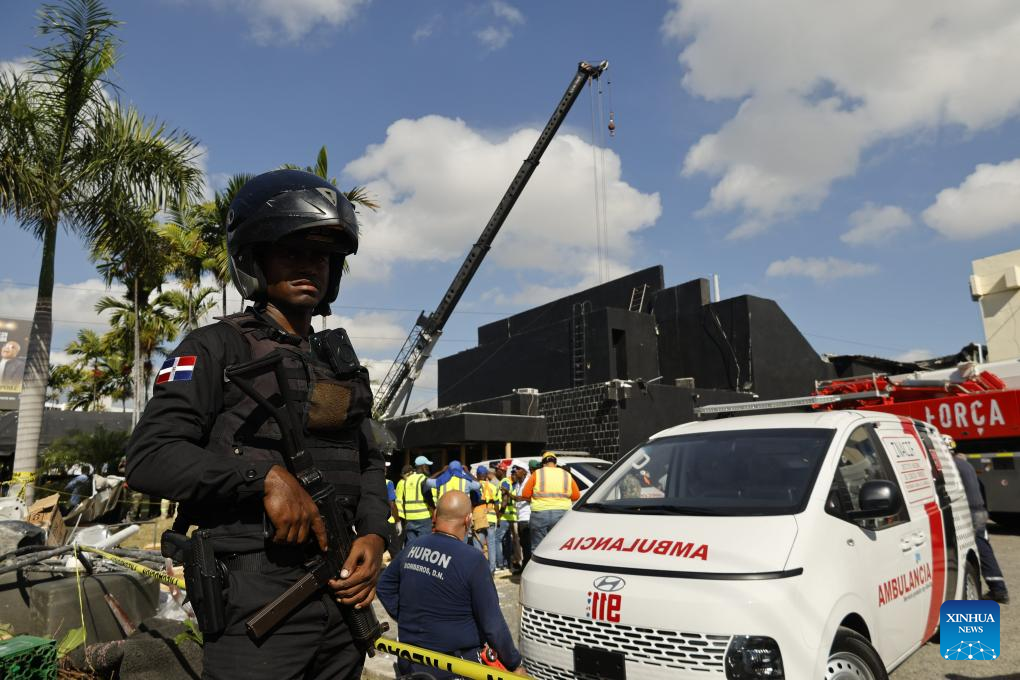 A policeman stands guard at the site of a nightclub roof collapse in Santo Domingo, the Dominican Republic, on April 8, 2025. (Str/Xinhua)
