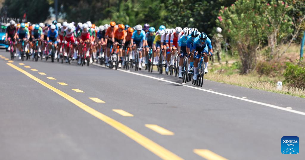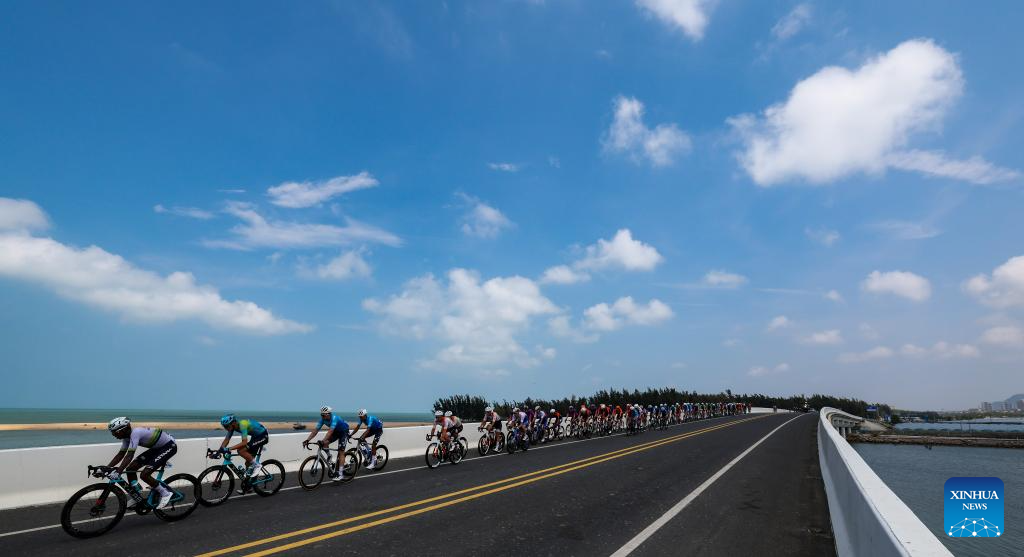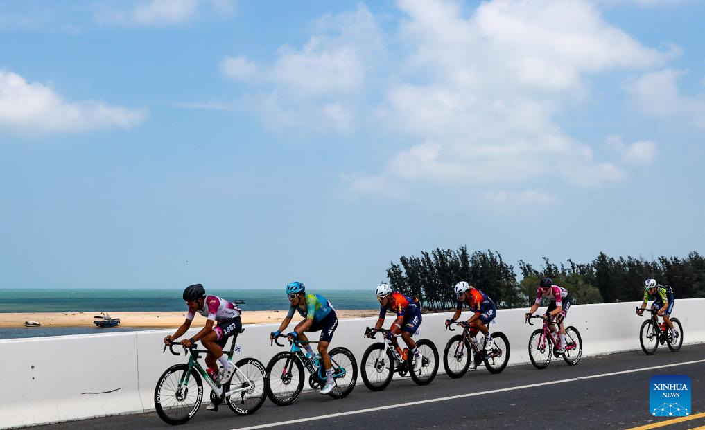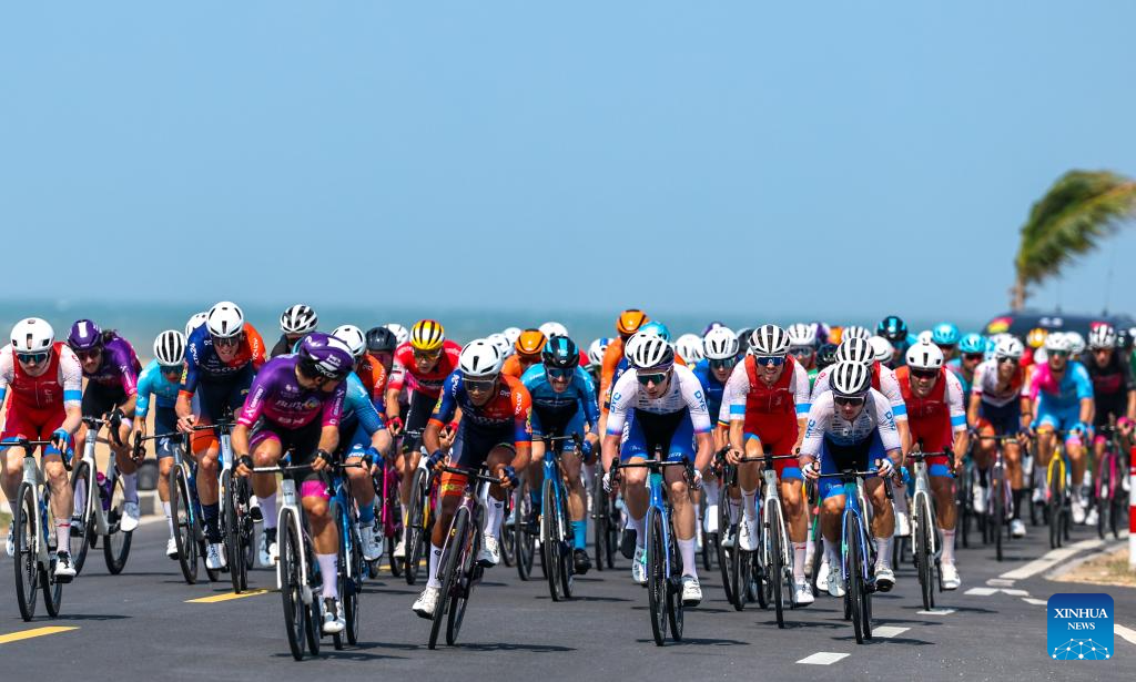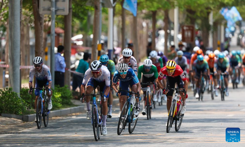 Cyclists compete during Stage 5 at the 16th Tour of Hainan cycling race from Dongfang to Sanya, south China's Hainan Province, April 11, 2025. (Xinhua/Yang Guanyu)