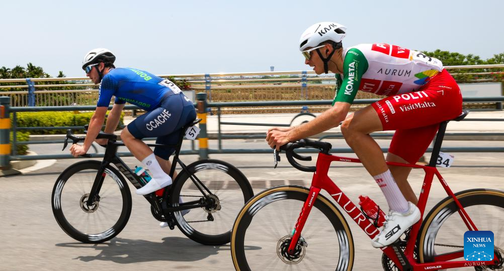 Andrea Pietrobon (R) of Team Polti VisitMalta and Liam Walsh of CCACHE X Bodywrap compete during Stage 5 at the 16th Tour of Hainan cycling race from Dongfang to Sanya, south China's Hainan Province, April 11, 2025. (Xinhua/Yang Guanyu)