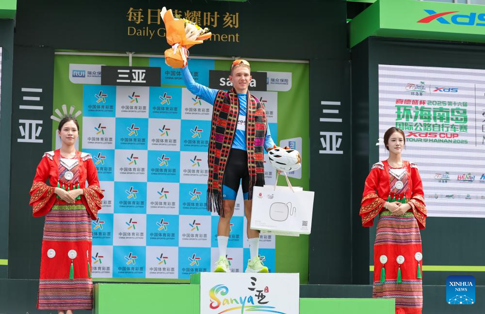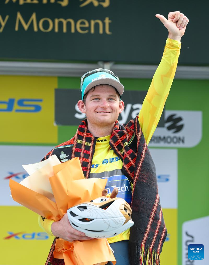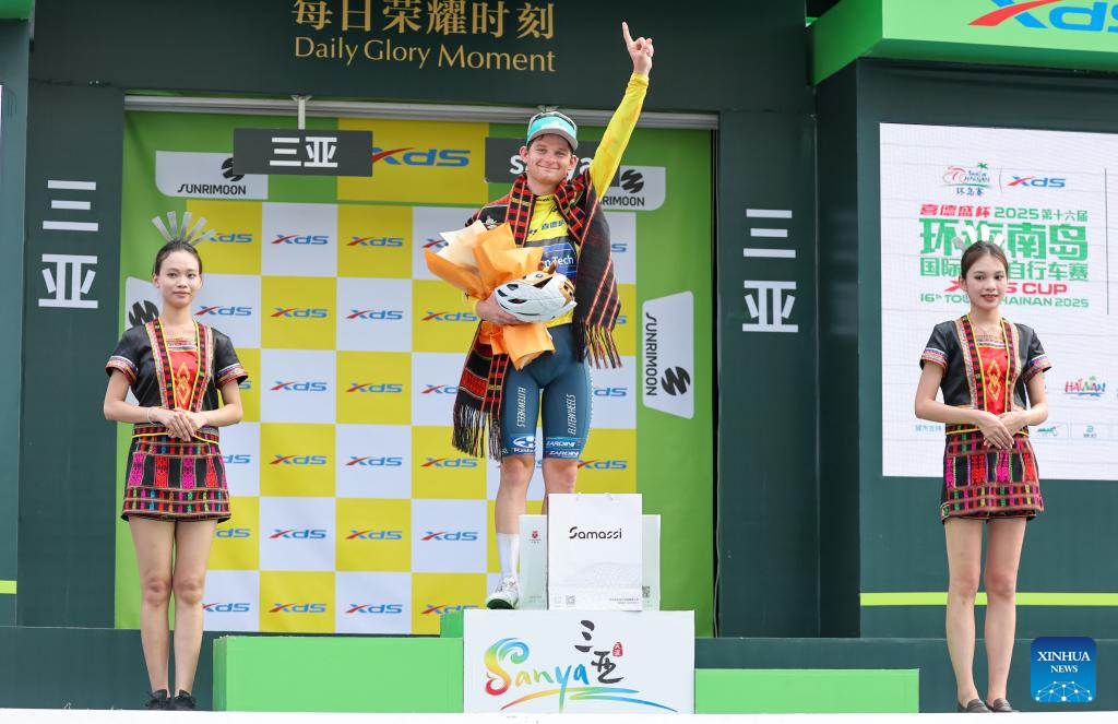 Alexander Salby of Li Ning Star celebrates during the awarding ceremony after Stage 5 at the 16th Tour of Hainan cycling race from Dongfang to Sanya, south China's Hainan Province, April 11, 2025. (Xinhua/Yang Guanyu)