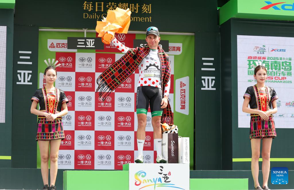 Nils Sinschek (C) of Parkhotel Valkenburg celebrates in the polka-dot jersey during the awarding ceremony after Stage 5 at the 16th Tour of Hainan cycling race from Dongfang to Sanya, south China's Hainan Province, April 11, 2025. (Xinhua/Yang Guanyu)