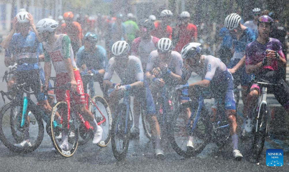 Karl Patrick Lauk of Quick Pro Team cools himself down during Stage 5 at the 16th Tour of Hainan cycling race from Dongfang to Sanya, south China's Hainan Province, April 11, 2025. (Xinhua/Yang Guanyu)