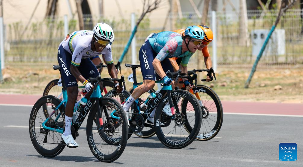 Aaron Murray Gate (C) of XDS Astana Team competes during Stage 5 at the 16th Tour of Hainan cycling race from Dongfang to Sanya, south China's Hainan Province, April 11, 2025. (Xinhua/Yang Guanyu)