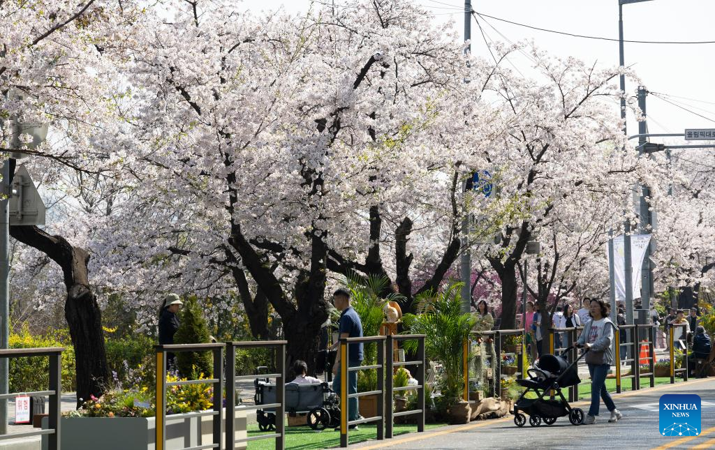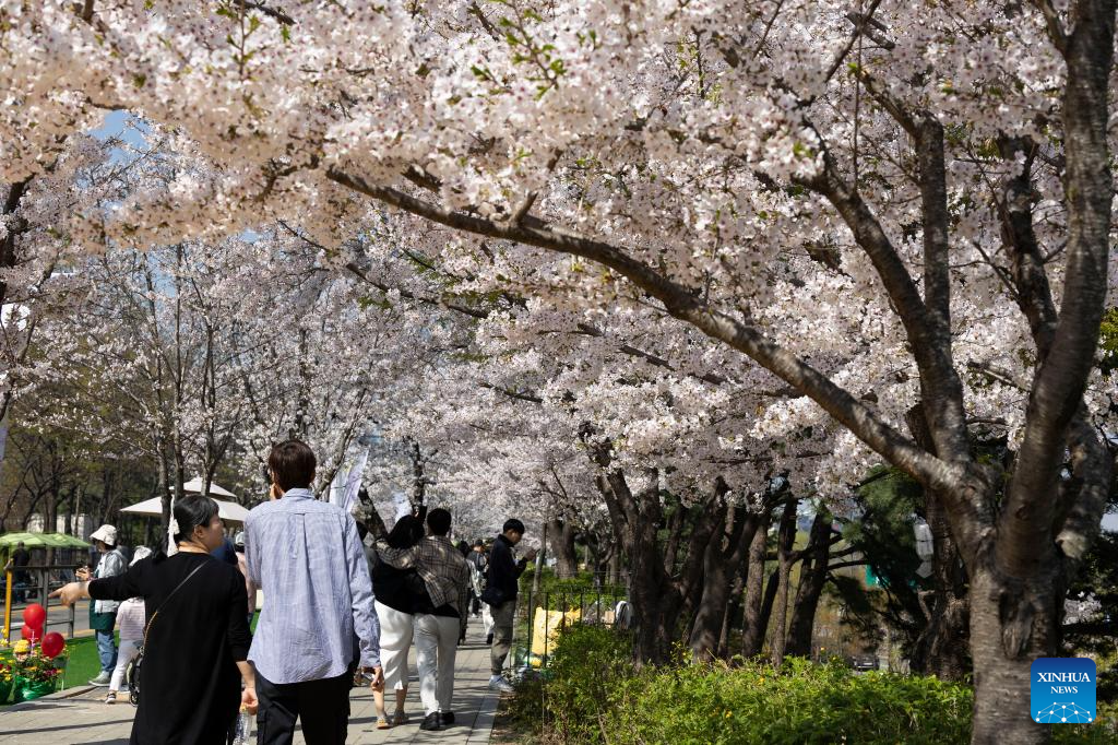 People walk under cherry blossoms at Yeouido Park in Seoul, South Korea, April 11, 2025. (Photo by Jun Hyosang/Xinhua)