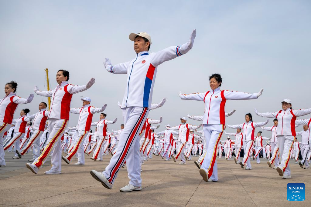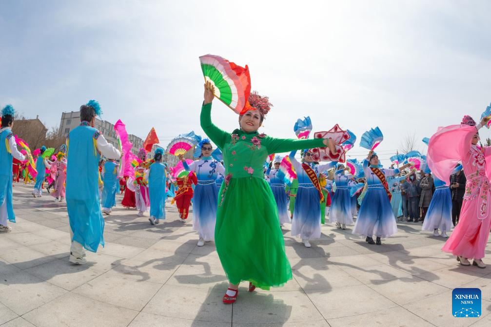 People perform at the main venue of Hanjiang festival in Jiamusi, northeast China's Heilongjiang Province, April 12, 2025. (Xinhua/Zhang Tao)