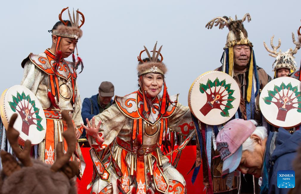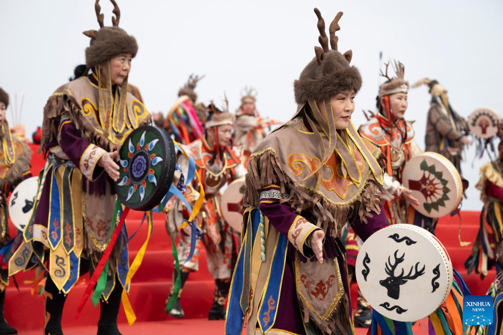 Actors perform a blessing ceremony of Hezhe ethnic group at the main venue of Hanjiang festival in Jiamusi, northeast China's Heilongjiang Province, April 12, 2025. (Xinhua/Zhang Tao)