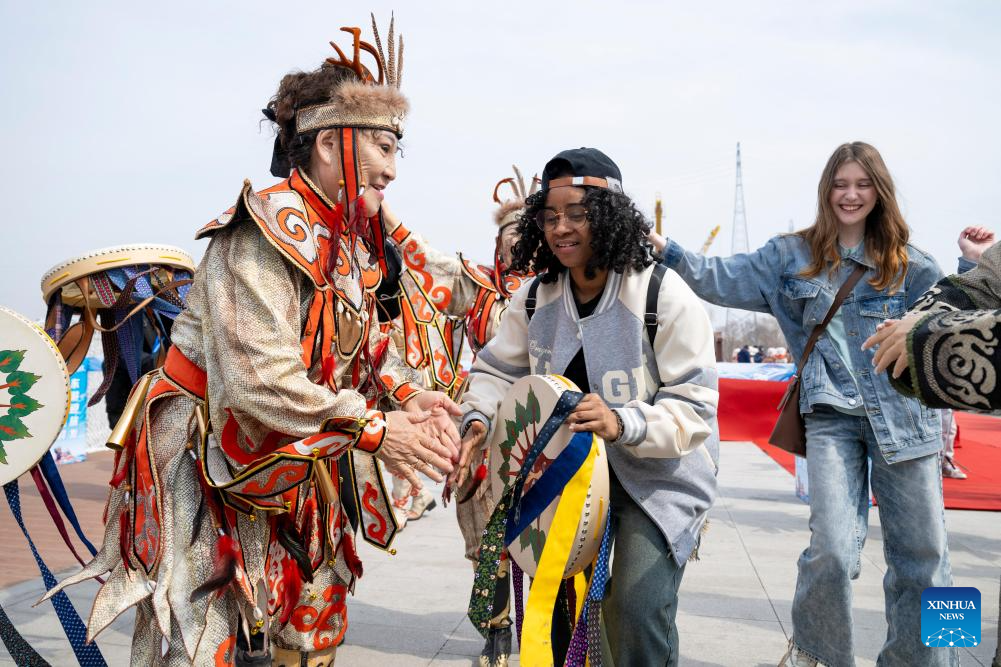 People take part in celebration events at the branch venue of Hanjiang festival in Fujin, northeast China's Heilongjiang Province, April 12, 2025. (Photo by Qu Yubao/Xinhua)