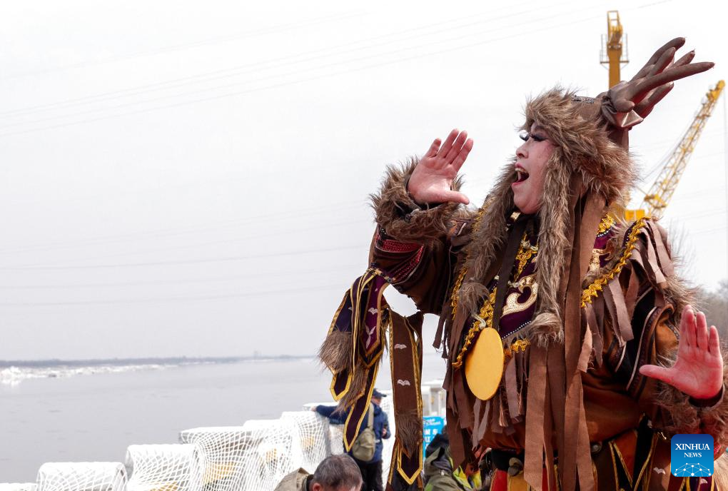 An actor of Hezhe ethnic group shouts to "awaken" the river at the main venue of Hanjiang festival in Jiamusi, northeast China's Heilongjiang Province, April 12, 2025. (Photo by Zhu Zongqiang/Xinhua)
