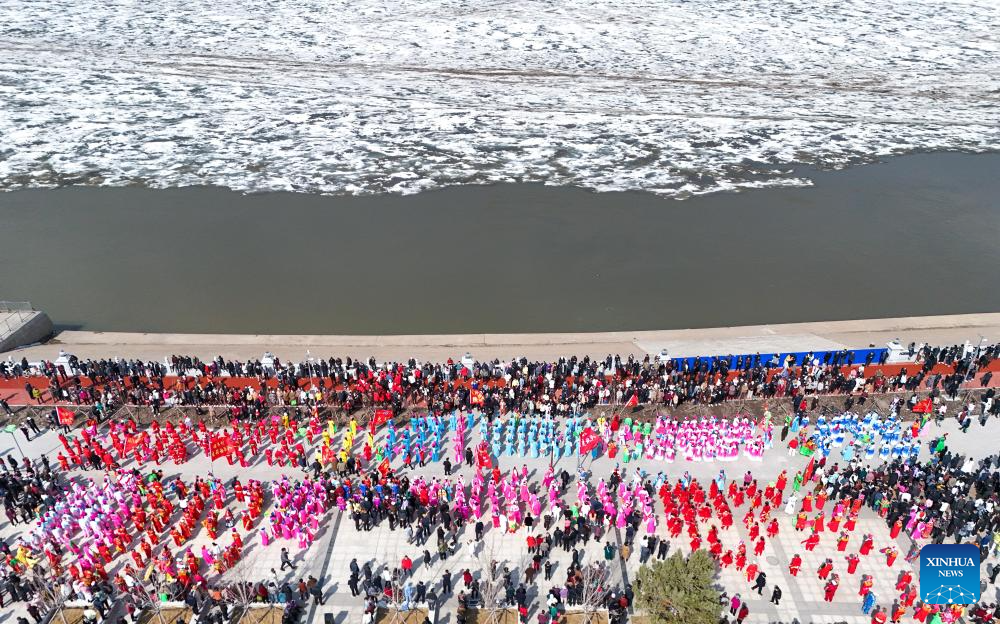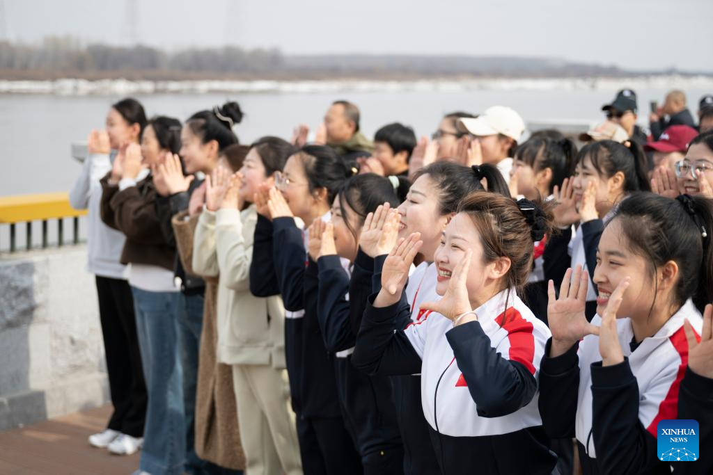 People shout to "awaken" the river at the main venue of Hanjiang festival in Jiamusi, northeast China's Heilongjiang Province, April 12, 2025. (Xinhua/Zhang Tao)