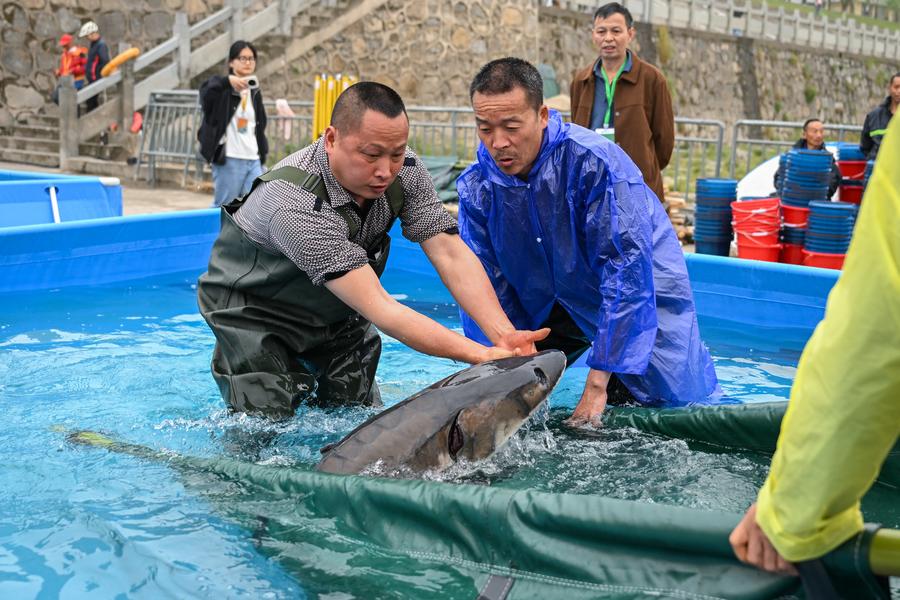YICHANG, April 12 (Xinhua) -- More than 20,000 second-generation Chinese sturgeons were released into the Yangtze River during a release activity here on Saturday.