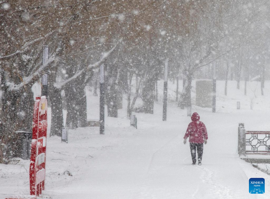 A citizen walks amid snow in Huma County, northeast China's Heilongjiang Province, April 12, 2025. Many parts in northern China are experiencing gale-force winds and temperature drops on Saturday. (Photo by Chu Fuchao/Xinhua)