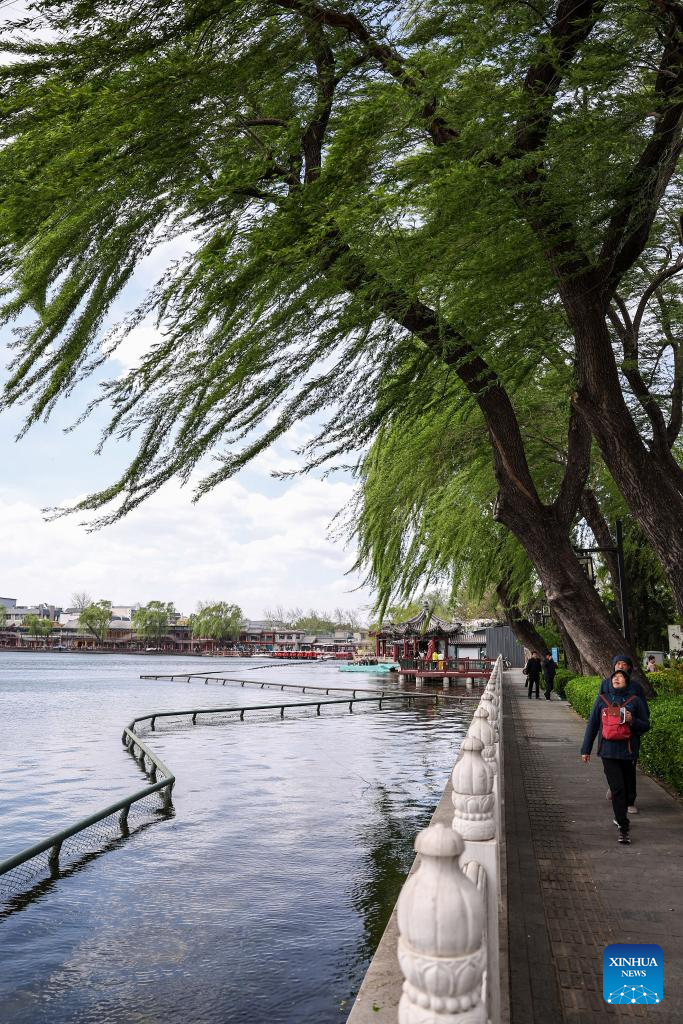 People walk at Shichahai scenic area in Beijing, capital of China, April 12, 2025. Many parts in northern China are experiencing gale-force winds and temperature drops on Saturday. (Xinhua/Jiang Han)