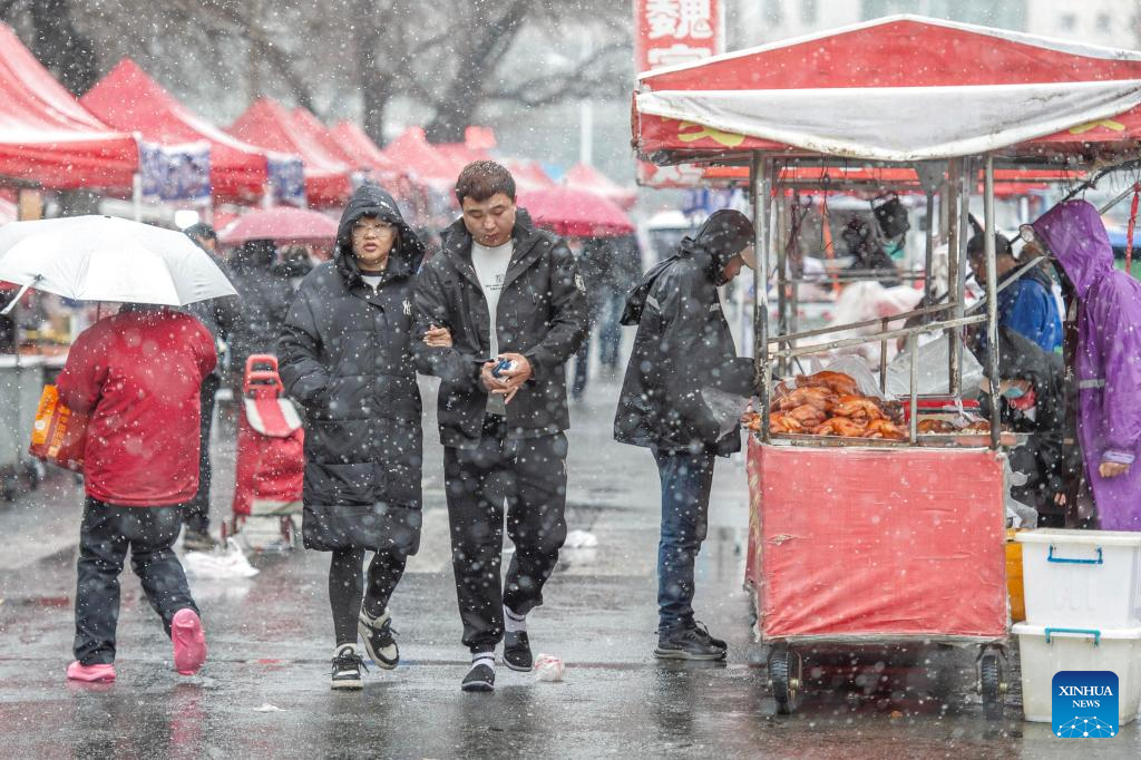 People visit a market amid snow in Qiqihar, northeast China's Heilongjiang Province, April 12, 2025. Many parts in northern China are experiencing gale-force winds and temperature drops on Saturday. (Photo by Wang Yonggang/Xinhua)