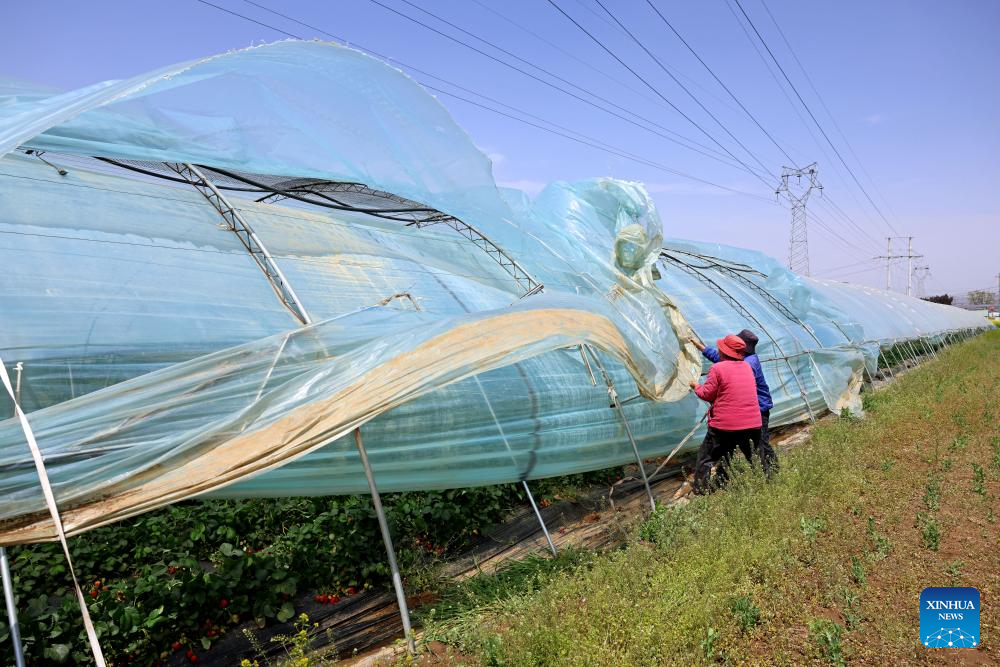 Farmers reinforce a strawberry greenhouse in the wind in Mengzhuang Town of Zaozhuang, east China's Shandong Province, April 12, 2025. Many parts in northern China are experiencing gale-force winds and temperature drops on Saturday. (Photo by Sun Zhongzhe/Xinhua)
