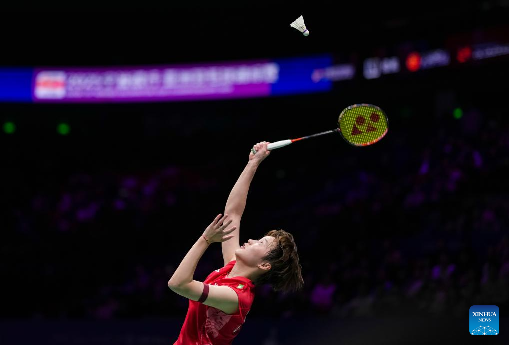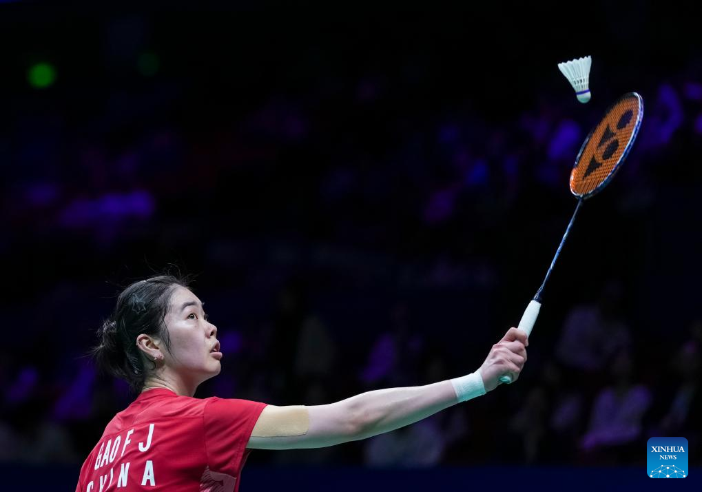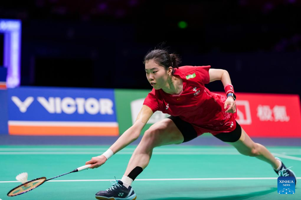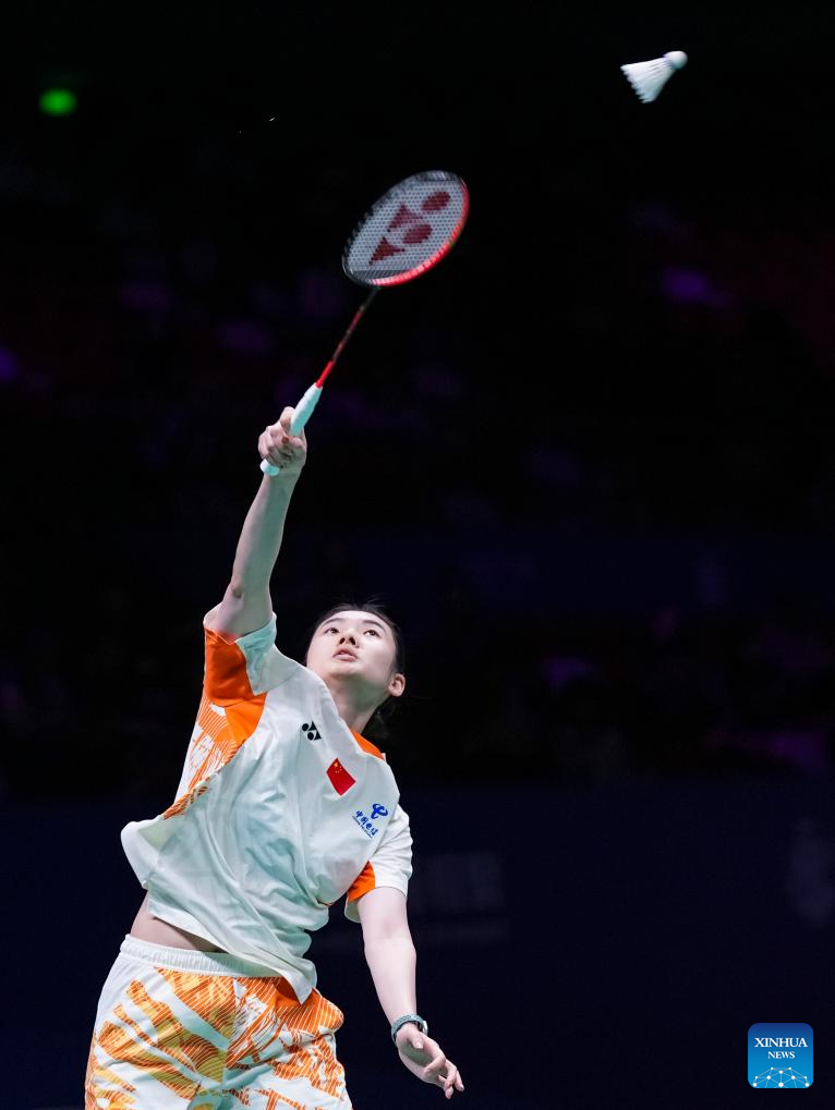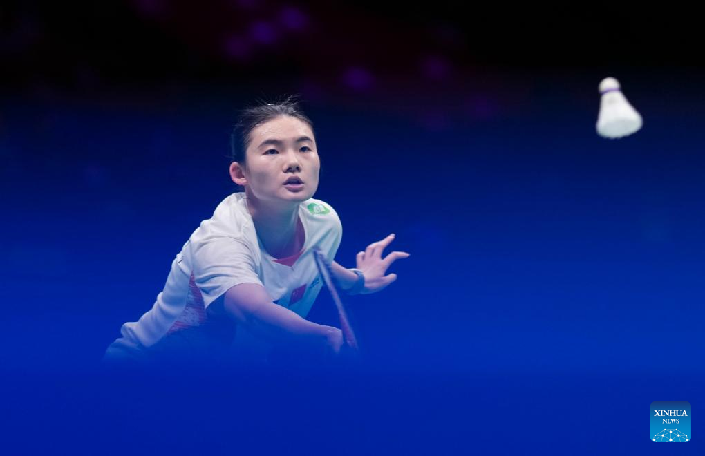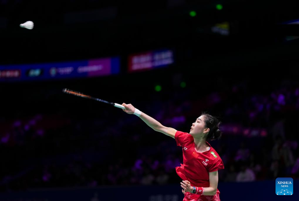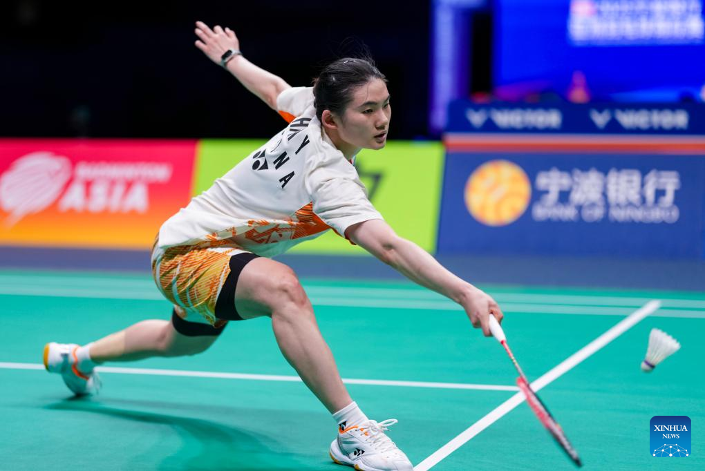 Gao Fangjie of China hits a return during the women's singles semifinal match against Han Yue of China at Badminton Asia Championships 2025 in Ningbo, east China's Zhejiang Province, April 12, 2025. (Xinhua/Sun Fei)