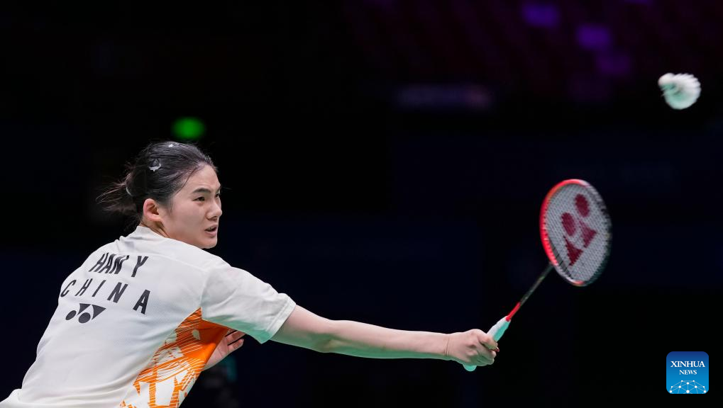 Han Yue of China hits a return during the women's singles semifinal match against Gao Fangjie of China at Badminton Asia Championships 2025 in Ningbo, east China's Zhejiang Province, April 12, 2025. (Xinhua/Sun Fei)