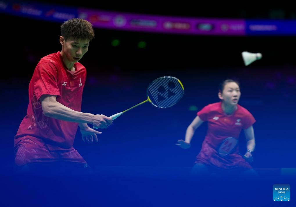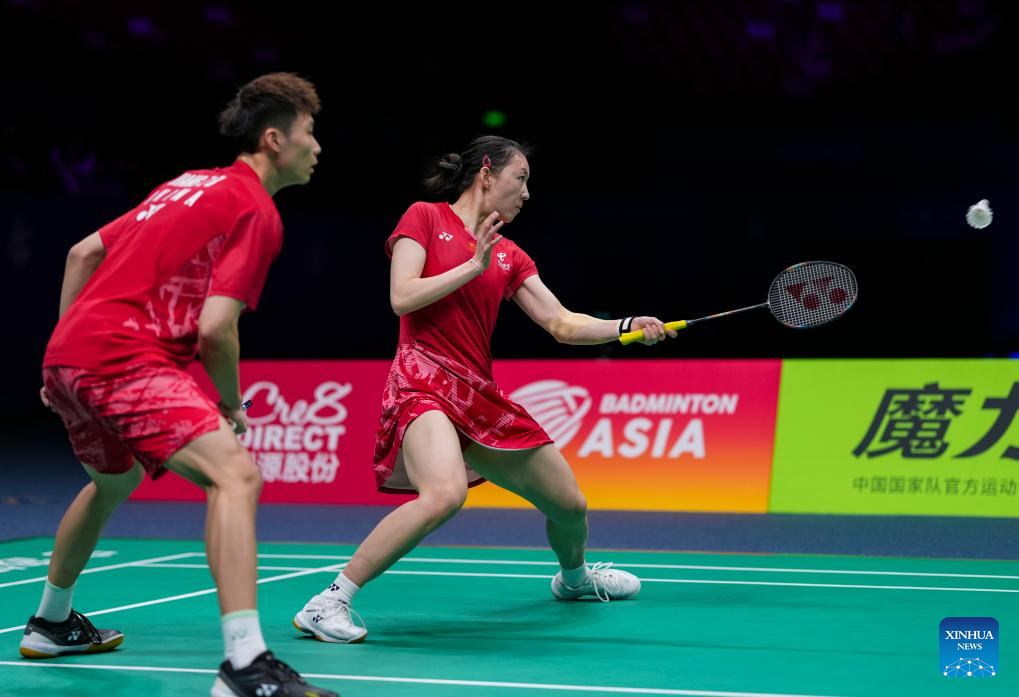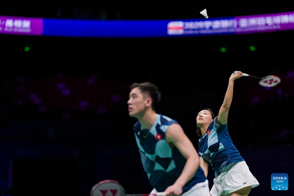 Tang Chun Man (L)/Tse Ying Suet of China's Hong Kong compete during the mixed doubles semifinal match against Jiang Zhenbang/Wei Yaxin of China at Badminton Asia Championships 2025 in Ningbo, east China's Zhejiang Province, April 12, 2025. (Xinhua/Sun Fei)